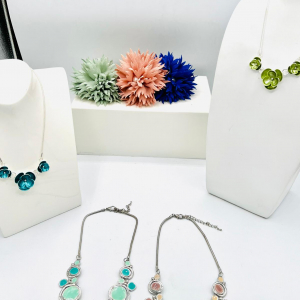 Le collier est en métal argenté et en émail avec de strass blancs qui ajoutent une touche d’éclat à votre look. Les boucles d’oreilles assorties complètent parfaitement cet ensemble.