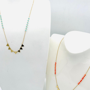 Ce collier fantaisie en métal doré est orné d’un pendentif délicat constitué de pampilles de perles colorées. Les perles de couleur ajoutent une touche de charme et de féminité à ce collier, lui donnant une allure à la fois moderne et intemporelle.