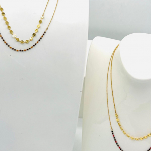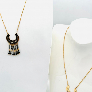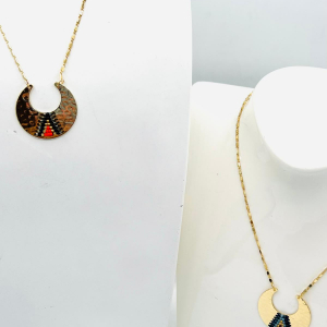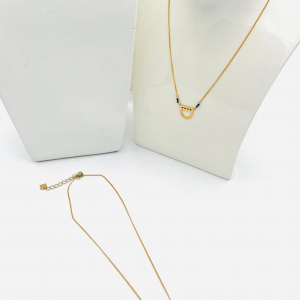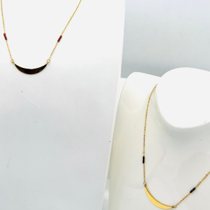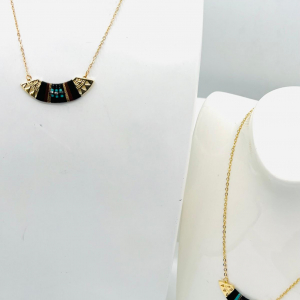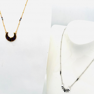 Il est agrémenté de petits pendentif en forme de triangle inversé, ajoutant une touche moderne à son design classique. Des perles fantaisies complètent le pendentif, apportant une note de féminité et de sophistication. Son fini doré lui confère un éclat subtil, tandis que sa taille discrète lui permet de se porter facilement avec d’autres bijoux. Avec ce collier, vous aurez…