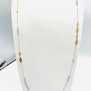 Découvrez ce somptueux collier orné de délicates perles qui sublimeront votre décolleté. Parfait pour ajouter une touche d’élégance à n’importe quelle tenue, ce collier combine une chaîne fine en or et des perles bleues intercalées pour un style à la fois raffiné et intemporel. Longueur de la chaîne : 60 cm. Diamètre des perles : 3 mm.