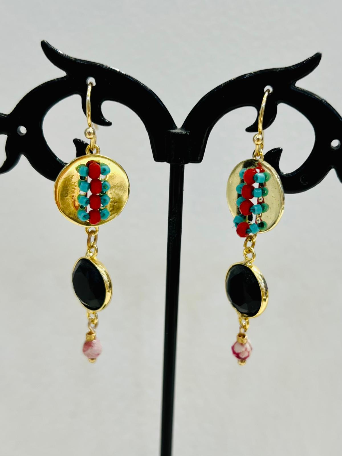 Élégantes et sophistiquées, ces boucles d’oreilles pendantes se distinguent par de pierres rouges, bleues et noires, magnifiquement montées sur une base dorée avec un design unique. Idéales pour apporter une touche de raffinement à n’importe quelle tenue, ces boucles d’oreilles mesurent 5 cm de longueur.