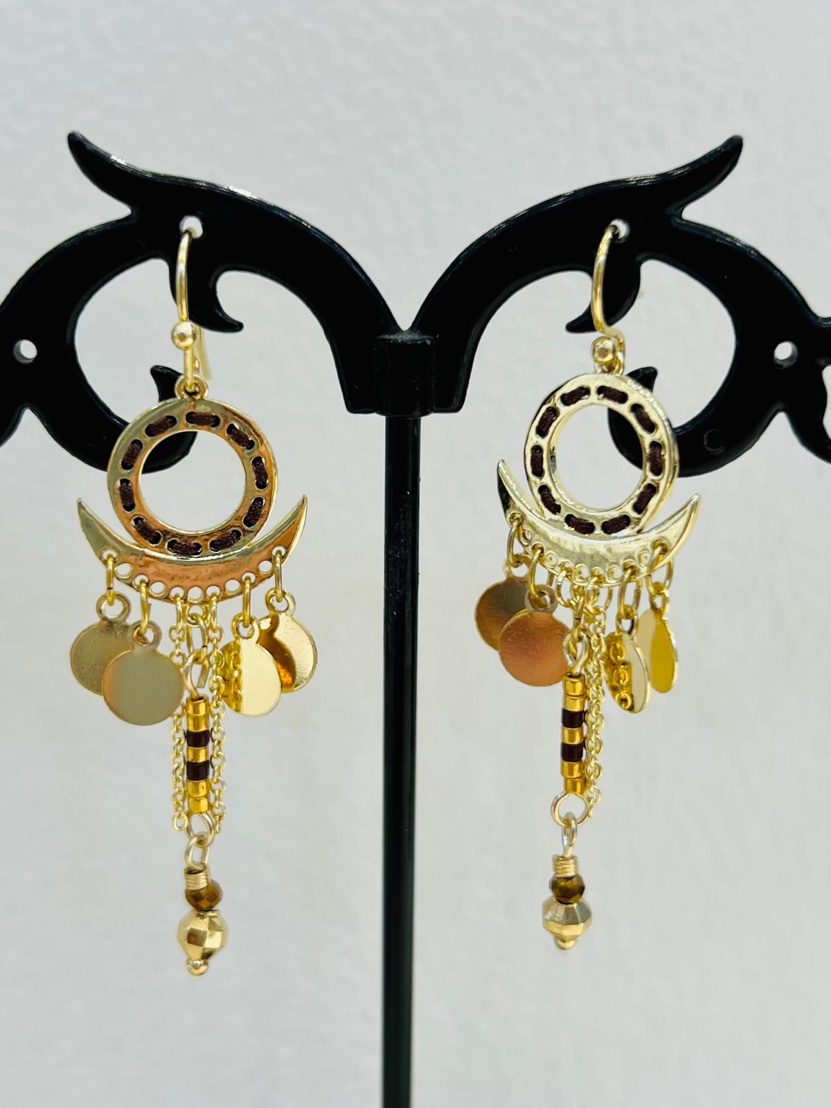 Découvrez l’élégance des boucles d’oreilles dorées et de pendentifs en forme de disque doré et de chaîne raffinée. Ces boucles d’oreilles sublimeront votre tenue en lui apportant une touche de sophistication incomparable. Avec un design unique et des finitions de haute qualité, elles sont parfaites pour toute occasion, qu’elle soit formelle ou décontractée. Dimensions : 5 cm de longueur.
