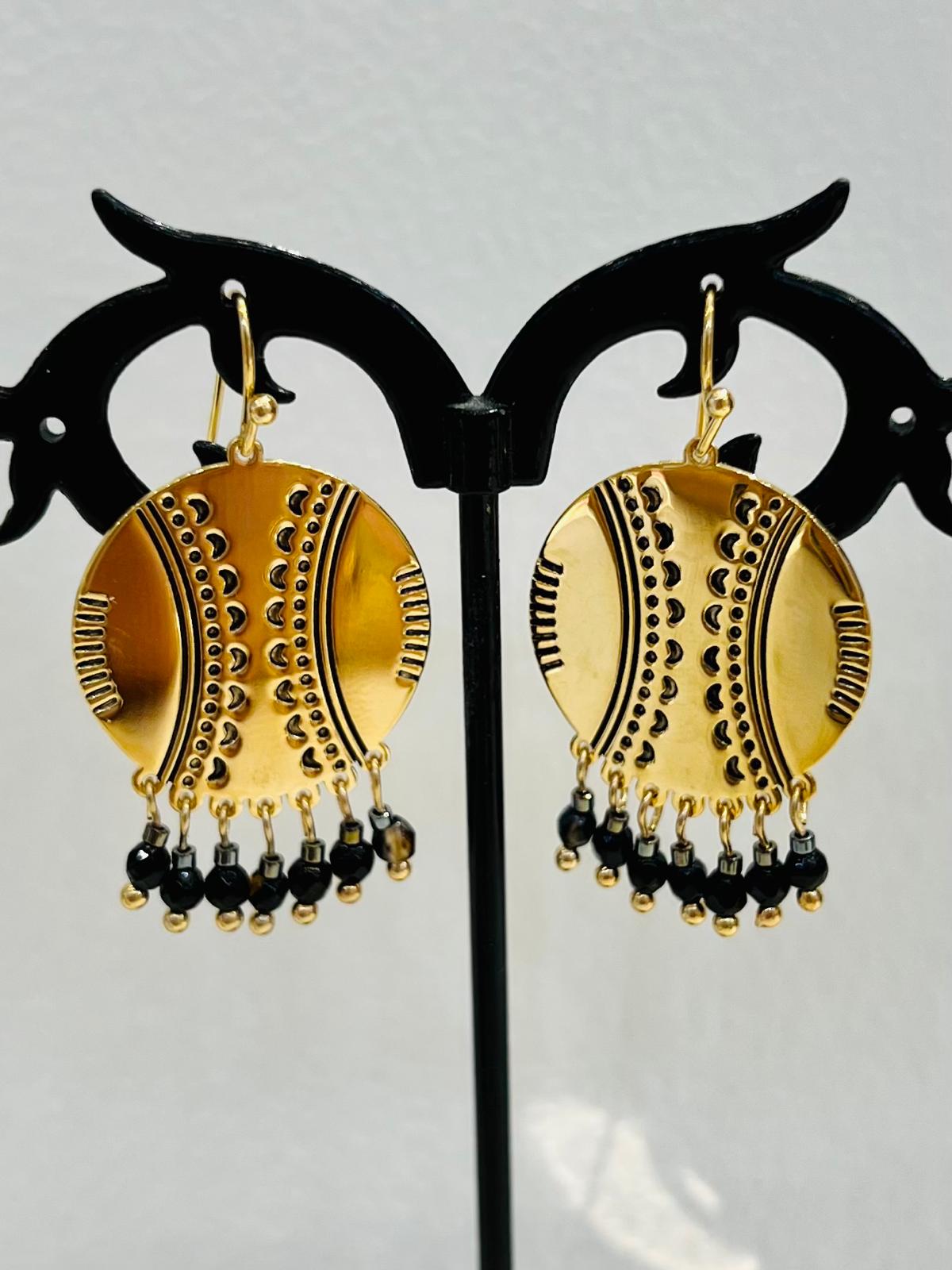 Découvrez ces somptueuses boucles d’oreilles fantaisies, conçues avec des motifs minutieusement détaillés et ornées de délicates petites perles suspendues. Leur design unique et sophistiqué en fait un accessoire incontournable pour toutes vos occasions spéciales. Dimensions : 3 cm de longueur. Couleur : doré.