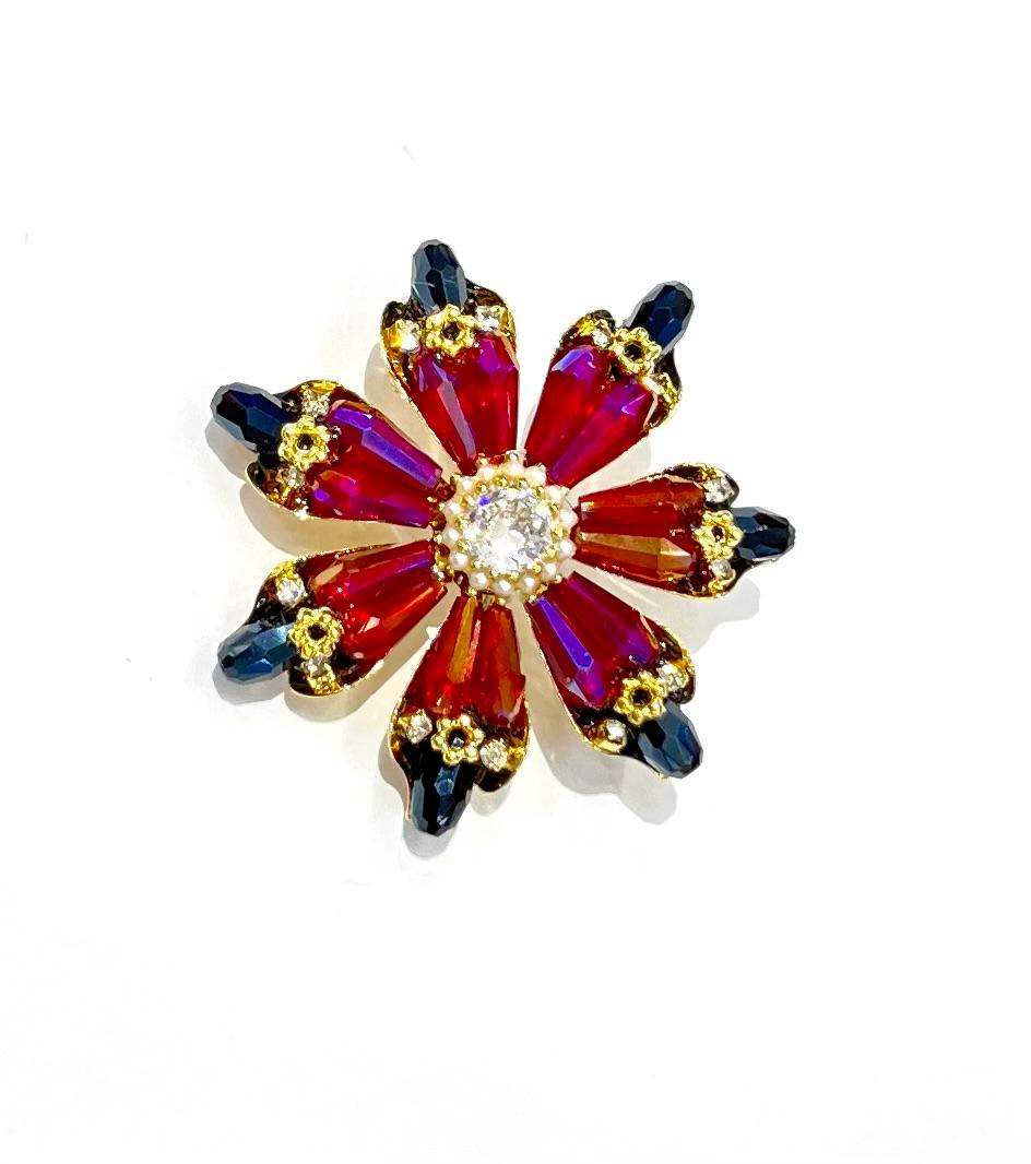 La Broche Fleur est une pièce raffinée et élégante, parée de pierres rouge profond et noir intense, qui entourent gracieusement une pierre centrale étincelante. Parfaite pour ajouter une touche de glamour et de sophistication à n’importe quelle tenue, cette broche est un incontournable de votre collection de bijoux. Dimensions : 5 cm x 5 cm.