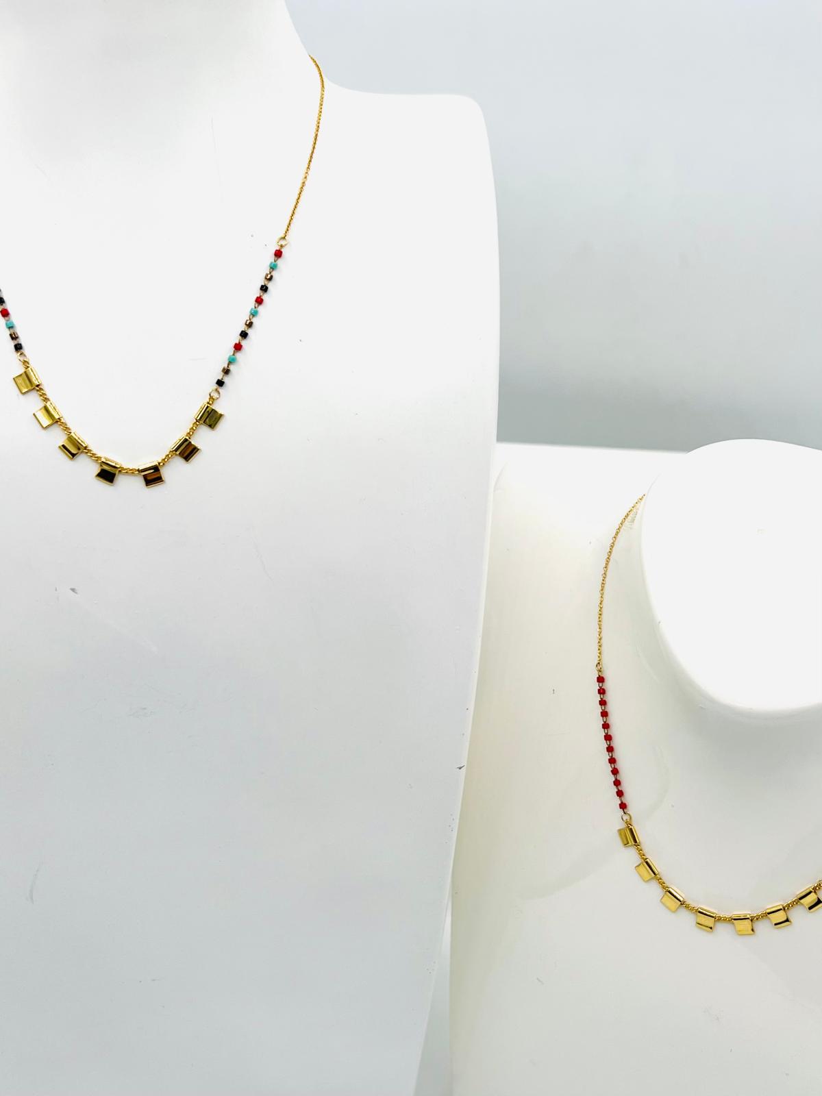 Le collier doré est orné de perles colorées et dorées, créant ainsi un magnifique contraste visuel. Les perles de différentes couleurs ajoutent de la vivacité à ce bijou, tandis que les perles dorées apportent une touche d’élégance et de sophistication.