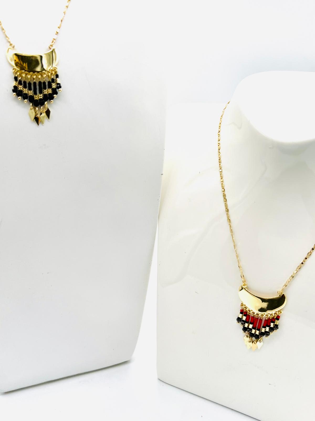 Ce collier en métal doré ou argenté est orné d’un pendentif et de délicates petites perles qui rehaussent l’élégance de l’ensemble. Avec son design raffiné et sa finition brillante, ce bijou apportera une touche de glamour à n’importe quelle tenue. Sa chaîne délicate s’ajuste parfaitement autour de votre cou. Les petites perles ajoutent une touche de sophistication.