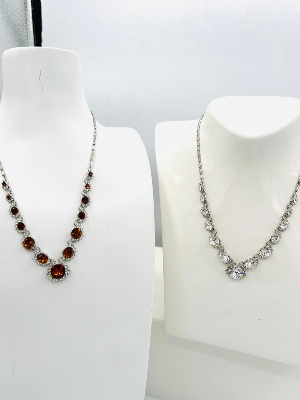 Le premier collier est magnifiquement orné de pierres marrons, tandis que le second arbore des pierres cristallines scintillantes. Parfaits pour sublimer vos tenues lors d’occasions spéciales ou apporter une touche de glamour à votre quotidien. Chacun de ces colliers mesure 45 cm, offrant une longueur idéale pour se poser délicatement sur votre cou.