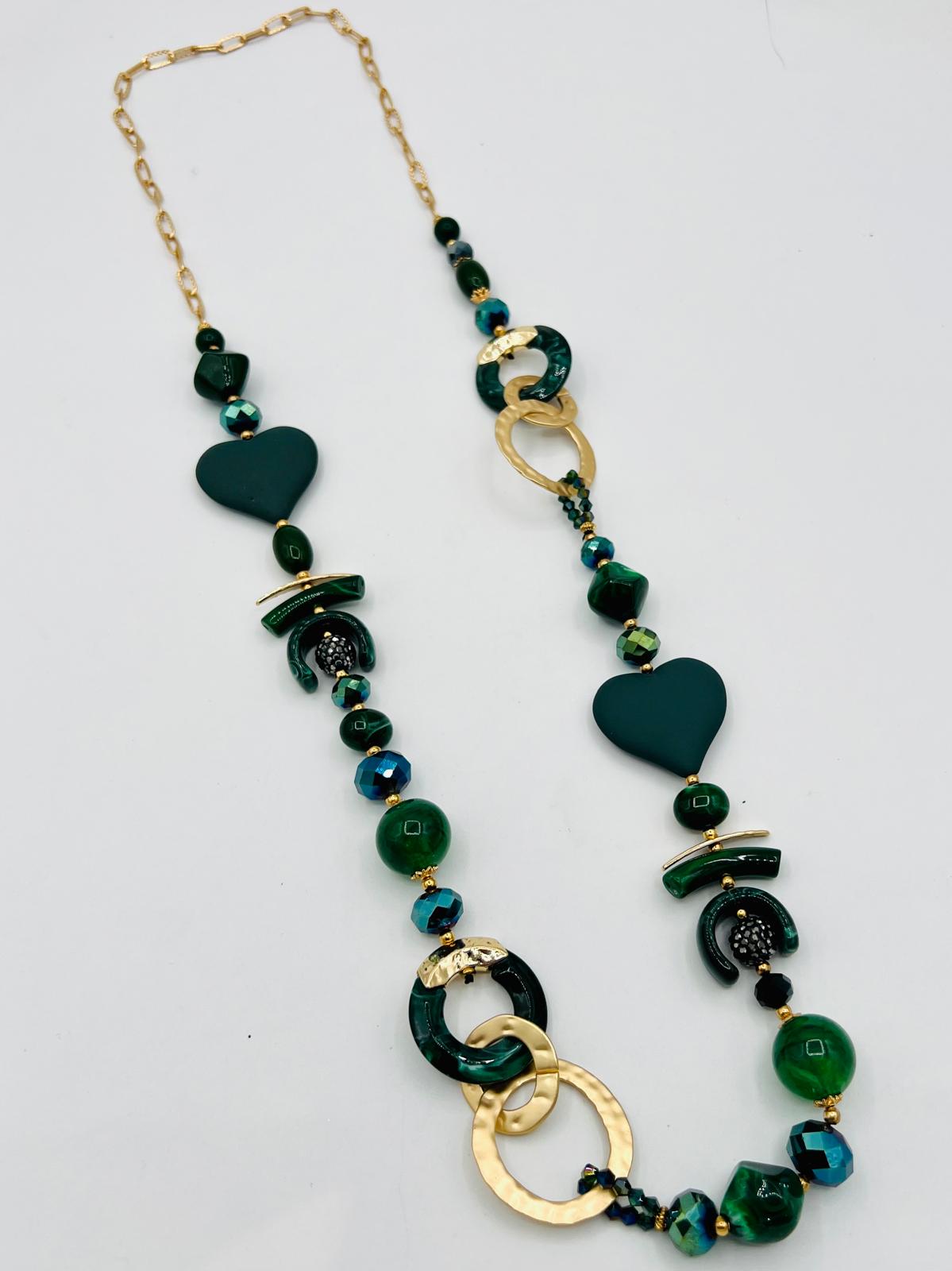 Découvrez l’élégance intemporelle de notre collier en perles et cœurs. Ce bijou fait la part belle à des perles vertes raffinées et des pendentifs exquis en forme de cœur. L’alliance des éléments confère à ce collier un charme irrésistible, idéal pour sublimer votre tenue en toute occasion.