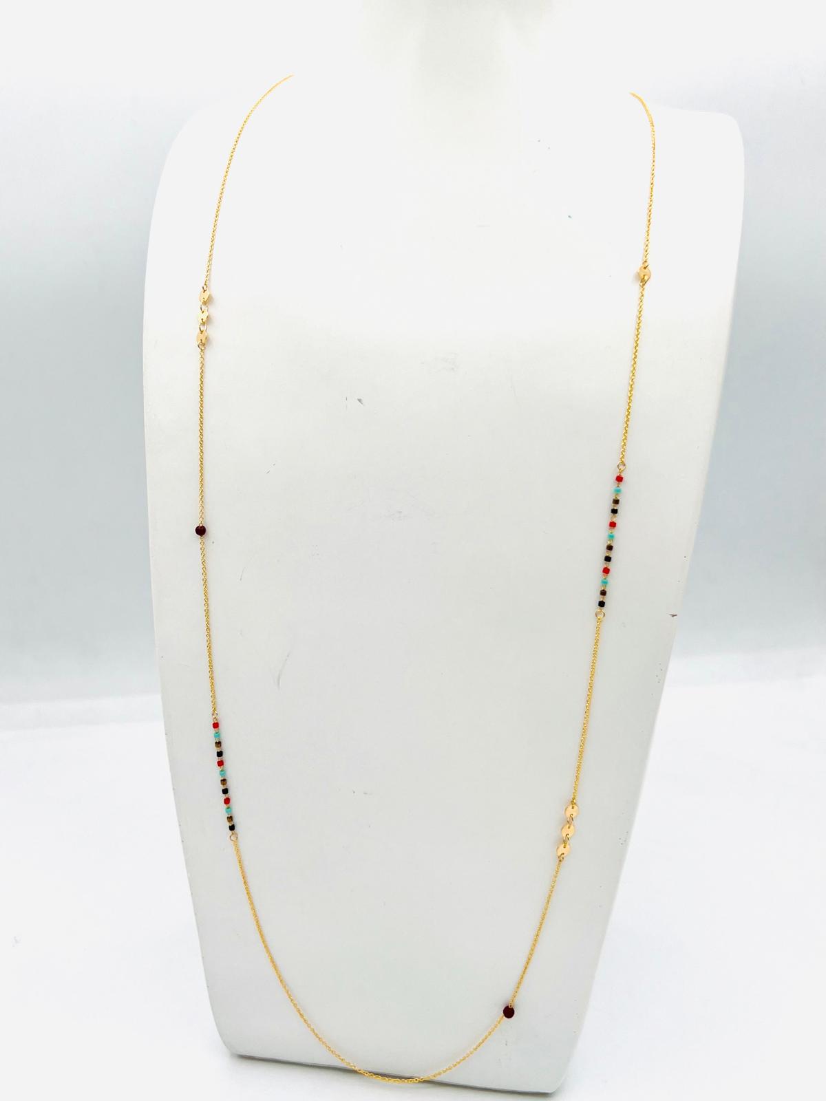 Découvrez l’élégance incarnée avec ce collier doré à l’or fin, magnifiquement agrémenté de petites perles multicolores. Chaque détail a été conçu pour ajouter une note de sophistication et de charme à votre ensemble. Parfait pour toutes les occasions, que ce soit pour une soirée élégante ou une journée décontractée, ce collier sublime votre apparence avec une touche de raffinement inégalée. Dimensions: longueur 45 cm, taille des perles 2-3 mm. Couleur: doré avec perles de différentes teintes pour un éclat radieux.