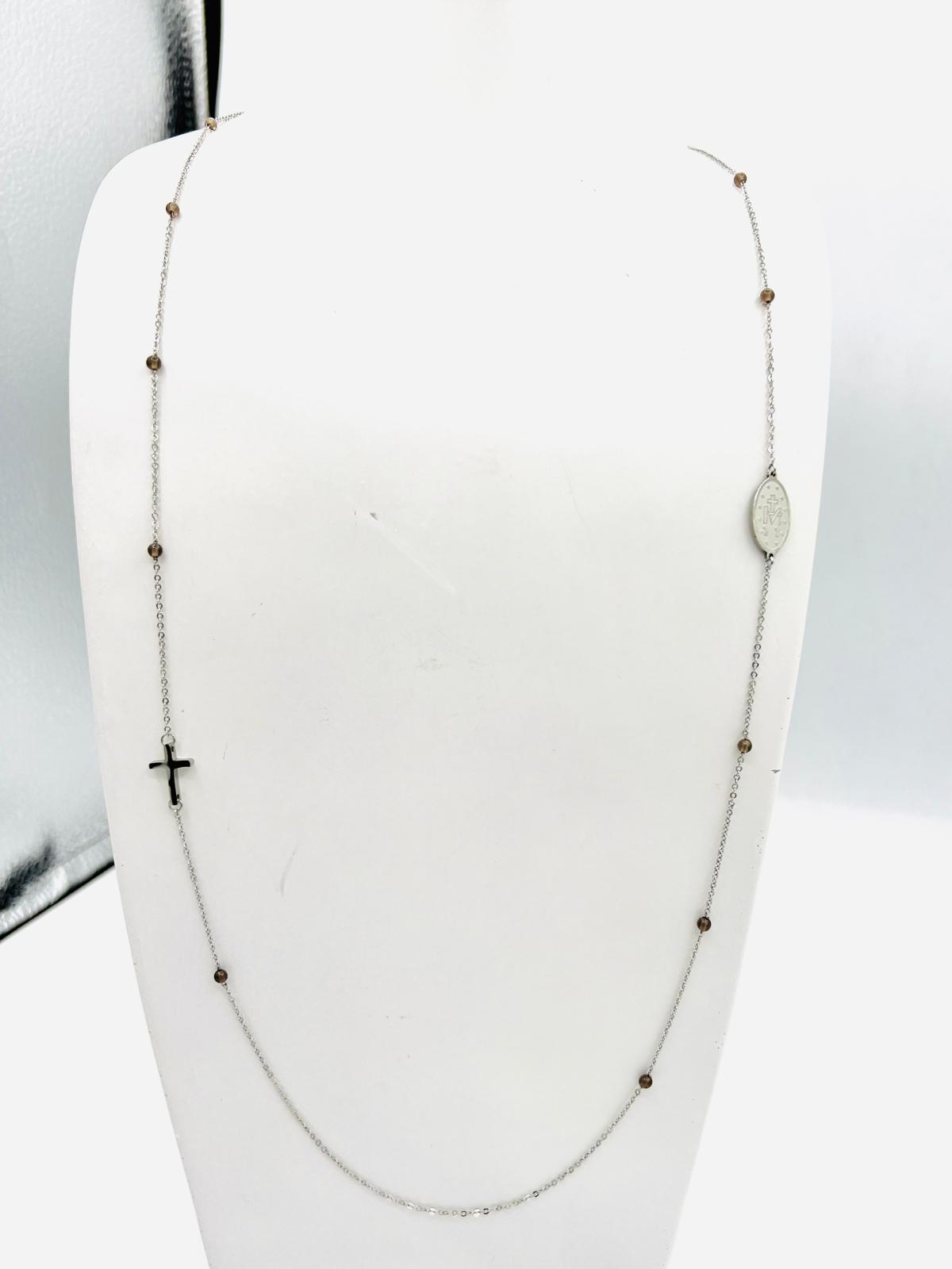 Sa chaîne délicate est minutieusement ornée de petites perles argentées qui ajoutent une touche d’élégance discrète. Ce collier est magnifié par deux pendentifs : une croix élégante et une médaille ovale texturée, chacun apportant une dimension unique et sophistiquée à la pièce. Longueur de la chaîne : 45 cm. Couleur : argenté éclatant.