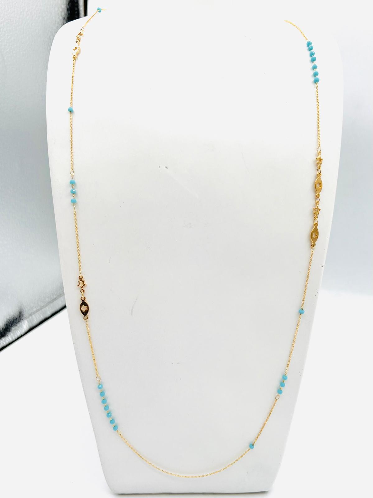 Découvrez ce somptueux collier orné de délicates perles qui sublimeront votre décolleté. Parfait pour ajouter une touche d’élégance à n’importe quelle tenue, ce collier combine une chaîne fine en or et des perles bleues intercalées pour un style à la fois raffiné et intemporel. Longueur de la chaîne : 60 cm. Diamètre des perles : 3 mm.