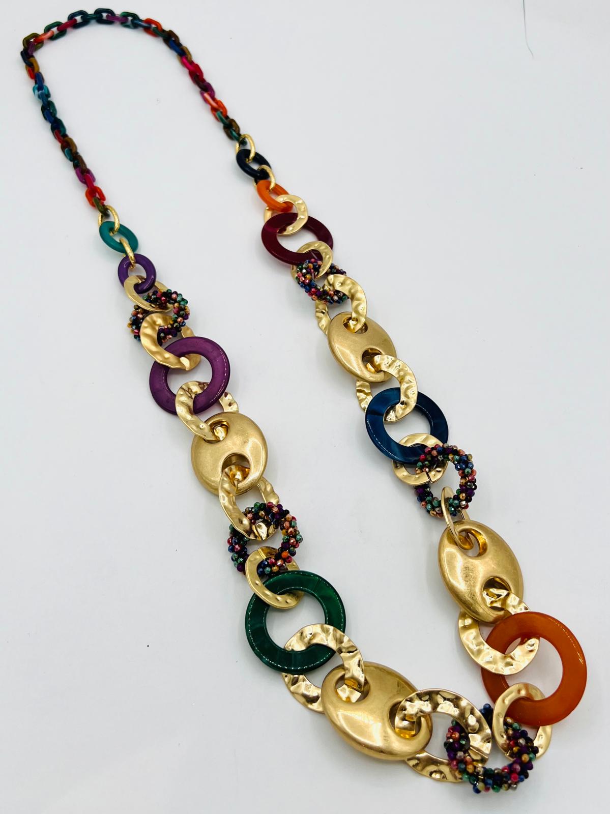 Un bijou unique qui marie l’éclat doré avec des maillons aux couleurs vives. Ce collier est l’accessoire parfait pour égayer n’importe quelle tenue. Avec une longueur idéale pour toutes les occasions, il sublimera votre décolleté tout en ajoutant une note de gaieté et de raffinement.
